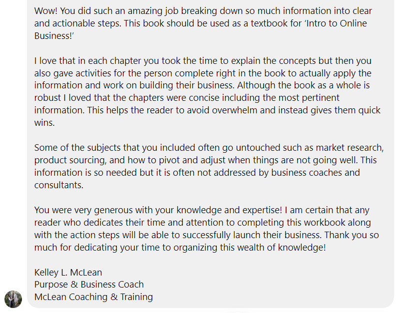 Once again, thank you so much for sharing so much of yourself and your knowledge and expertise with us. I can't tell you how much I appreciate you, your textbook, and your dedication to the success of us entrepreneurs. Truly priceless!!
