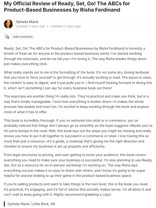 Risha is the Author of "Ready . Set . Go: The ABC's for Product-based Businesses".